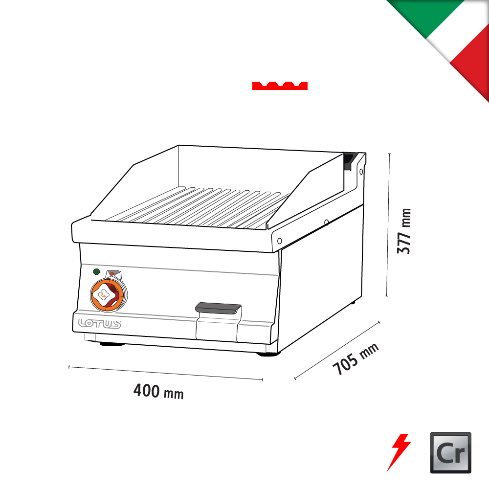 Πλατώ ηλεκτρικό μονό ραβδωτό χρωμίου , του εργοστασίου Lotus Χώρα προέλευσης : Ιταλία Κατασκευασμένο με χρήση ανοξείδωτου χάλυβα ποιότητας (CrNi 18/10 AISI 304) , με διακόπτες αδιάβροχης ποιότητας (IPX5).