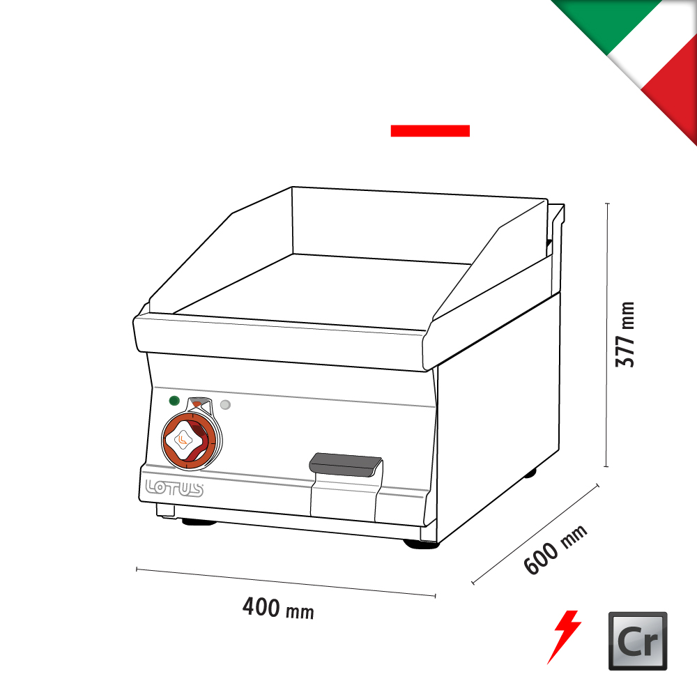 Πλατώ ηλεκτρικό μονό λείο χρωμίου , του εργοστασίου Lotus Ιταλίας. Κατασκευασμένο με χρήση ανοξείδωτου χάλυβα ποιότητας (CrNi 18/10 AISI 304) , με διακόπτες αδιάβροχης ποιότητας (IPX5).