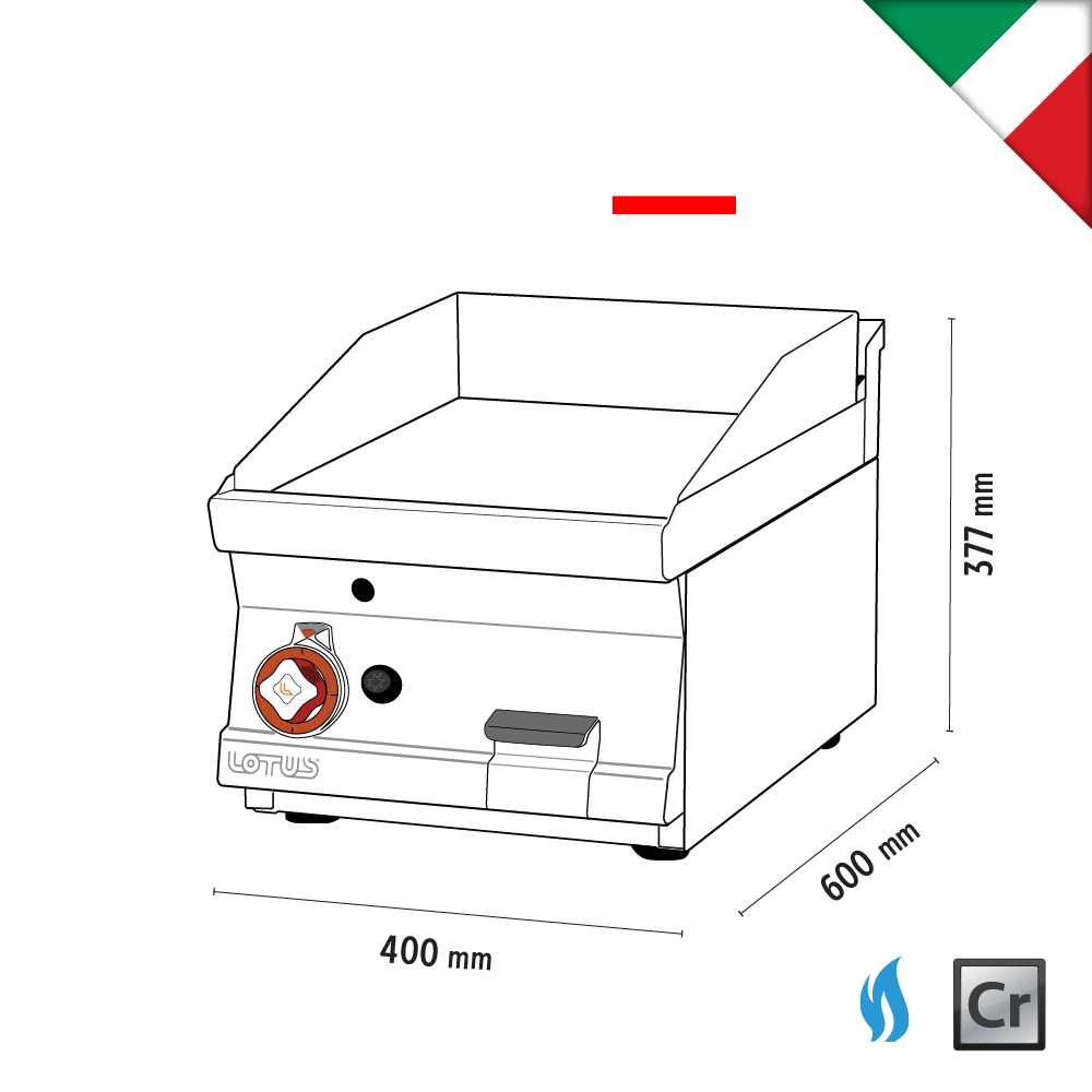 Πλατώ αερίου, μονό λείο, χρωμίου, του εργοστασίου Lotus Ιταλίας. Κατασκευασμένο με χρήση ανοξείδωτου χάλυβα ποιότητας (CrNi 18/10 AISI 304) , με διακόπτες αδιάβροχης ποιότητας (IPX5).