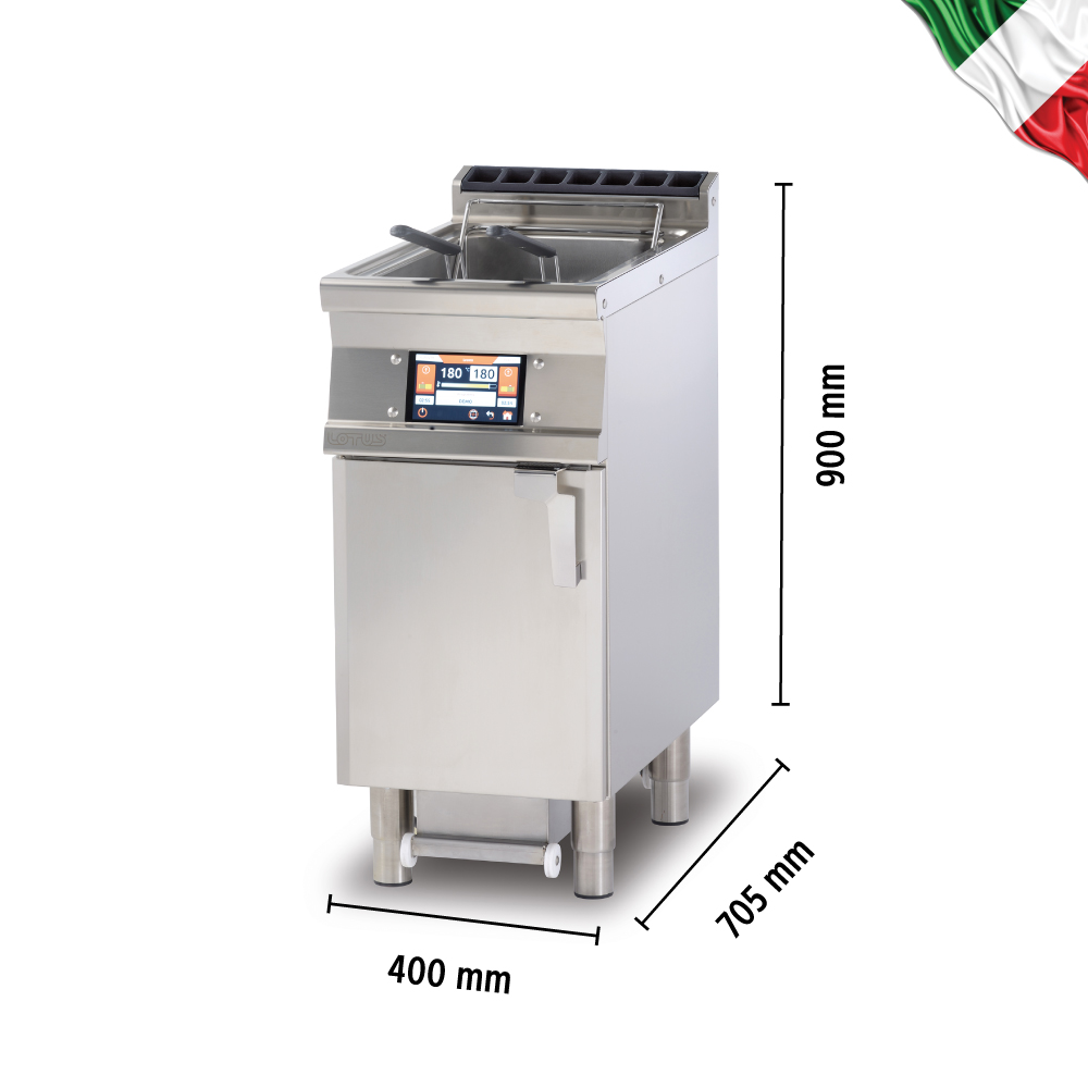 Αυτόματη ηλεκτρική φριτέζα με οθόνη touch 7΄΄ , του εργοστασίου Lotus. Διατήρηση θερμοκρασίας στους 110°C ή προθέρμανση στους 160°C με ή χωρίς λιώσιμο μαγειρικού λίπους (λειτουργία Melting) Δυνατότητα εισαγωγής στην μνήμη έως 100 προγραμμάτων Αισθητήριο πλήρωσης & μέγιστου επιπέδου φόρτωσης λαδιού