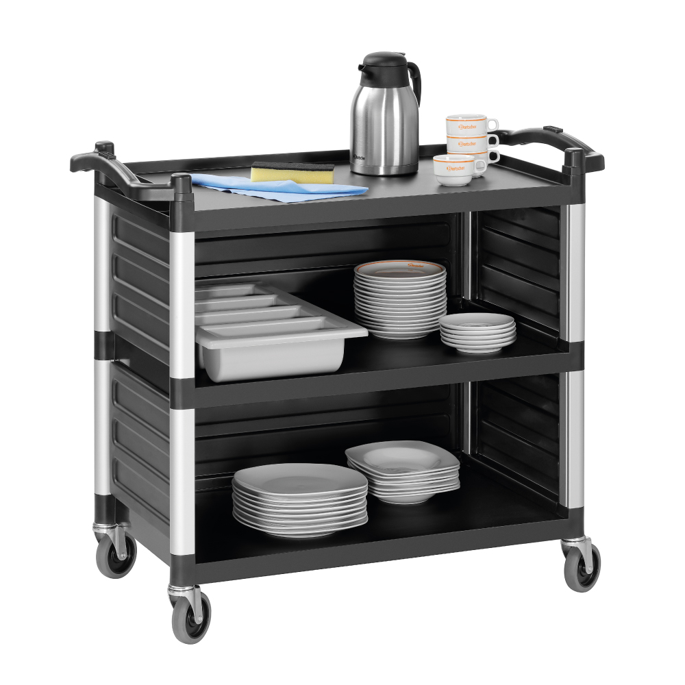 Καρότσι σερβιρίσματος 3 επιπέδων (785x485mm) ,TSA300V Bartscher Γερμανίας. Χάρη στην επένδυσή και από τις τρεις πλευρές, το ελαφρύ και αθόρυβο καρότσι κρατάει κρυφά τα είδη που μεταφέρονται, όπως για παράδειγμα τα βρώμικα πιάτα. Το καρότσι σερβιρίσματος με 3 ράφια μπορεί να χρησιμοποιηθεί με ποικίλους τρόπους, όπως για σερβίρισμα, τακτοποίηση και μεταφορά.