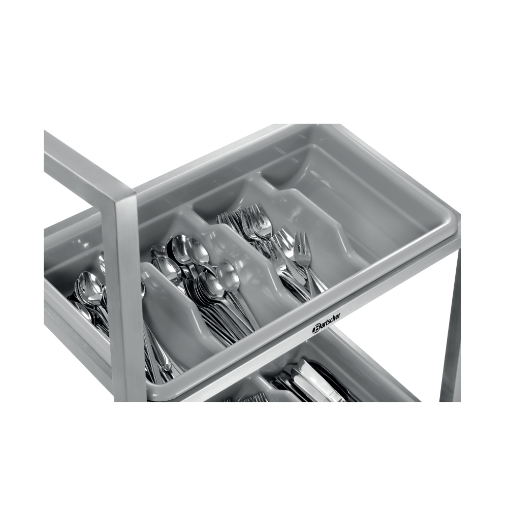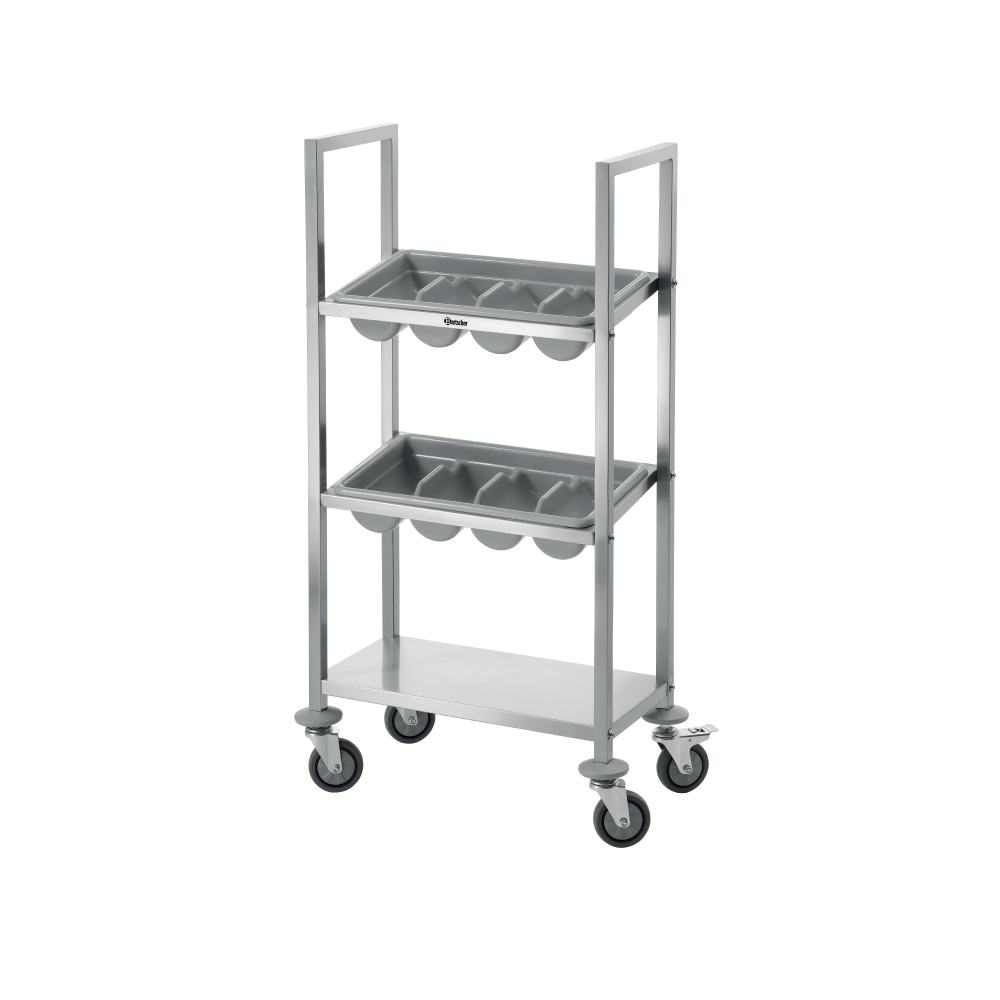 Καρότσι μεταφοράς για μαχαιροπίρουνα με 3 επίπεδα (590x310mm) , TBST200 Bartscher Γερμανίας. Το καρότσι για μαχαιροπίρουνα διευκολύνει τη διαδικασία εργασίας σε διάφορους τομείς. Μικρών διαστάσεων και με καλή ταξινόμηση στην αποθήκευση, πρακτικό και φιλικό για τον χρήστη στον τομέα της εξυπηρέτησης. Τα τραπέζια μπορούν να εξυπηρετηθούν, αλλά και να τακτοποιηθούν πιο γρήγορα και πιο εύκολα με το φορητό καρότσι μεταφοράς μαχαιροπίρουνων της Bartscher.