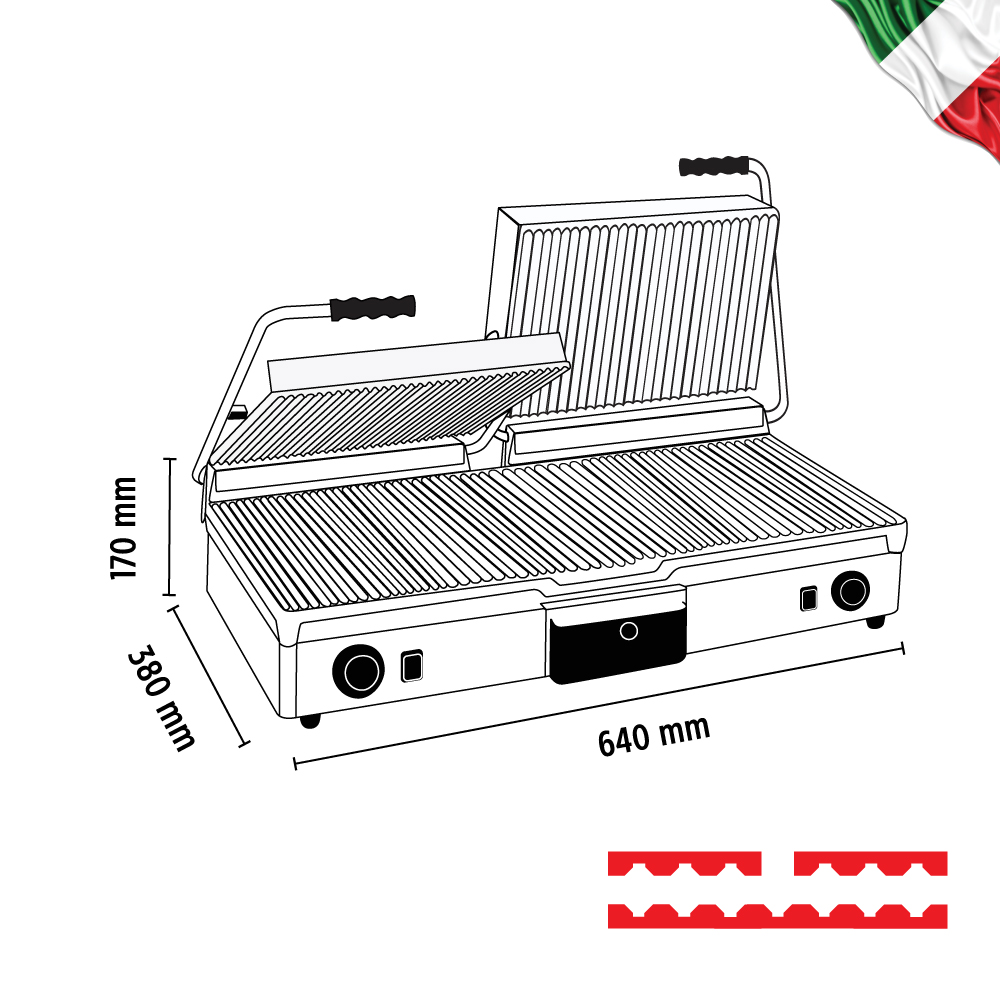 Τοστιέρα διπλή ραβδωτή πάνω & κάτω , Milantoast Ιταλίας. Επαγγελματική τοστιέρα μαντεμένια , με δομή από ανοξείδωτο χάλυβα και αντικολλητικές πλάκες από χυτοσίδηρο, κατασκευασμένη με ειδική επιφανειακή κεραμική επίστρωση που κάνει τις πλάκες ιδιαίτερα ανθεκτικές στα οξέα, το αλάτι και τη διάβρωση, ενώ επιτρέπει τον εύκολο και γρήγορο καθαρισμό. Οι αντικολλητικές πλάκες από χυτοσίδηρο είναι γνωστές για τις ιδιότητες συγκράτησης της θερμότητας και επιτρέπουν γρήγορους χρόνους θέρμανσης και εξαιρετική διατήρηση της θερμότητας ώστε να προσφέρουν τα εξαιρετικά και σταθερά αποτελέσματα μαγειρέματος που απαιτούνται για μια γρήγορη παρασκευή φαγητού. Η τοστιέρα 16050 της Milantoast είναι η ιδανική επιλογή για εστιατόρια και καφετέριες καθώς είναι πολύ εύκολη στη χρήση με την αυτοεξισορροπούμενη επάνω πλάκα της με ρυθμιζόμενη πίεση κλεισίματος στο πάχος του φαγητού και την αποστράγγιση λίπους στο κάτω μέρος.