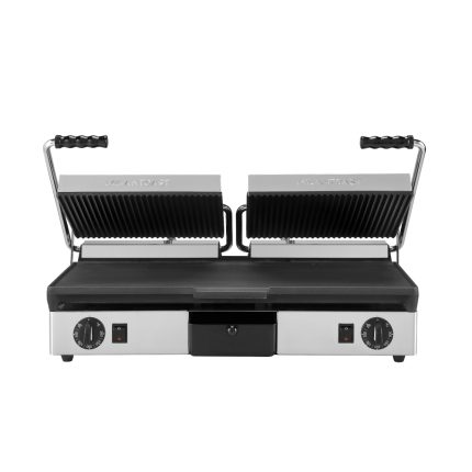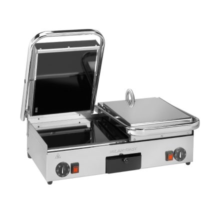 Τοστιέρα μεσαία ραβδωτή πάνω & κάτω, Milantoast Ιταλίας. Επαγγελματική τοστιέρα μαντεμένια , με δομή από ανοξείδωτο χάλυβα και αντικολλητικές πλάκες από χυτοσίδηρο, κατασκευασμένη με ειδική επιφανειακή κεραμική επίστρωση που κάνει τις πλάκες ιδιαίτερα ανθεκτικές στα οξέα, το αλάτι και τη διάβρωση, ενώ επιτρέπει τον εύκολο και γρήγορο καθαρισμό. Οι αντικολλητικές πλάκες από χυτοσίδηρο είναι γνωστές για τις ιδιότητες συγκράτησης της θερμότητας και επιτρέπουν γρήγορους χρόνους θέρμανσης και εξαιρετική διατήρηση της θερμότητας ώστε να προσφέρουν τα εξαιρετικά και σταθερά αποτελέσματα μαγειρέματος που απαιτούνται για μια γρήγορη παρασκευή φαγητού. Η τοστιέρα 16030 της Milantoast είναι η ιδανική επιλογή για εστιατόρια και καφετέριες καθώς είναι πολύ εύκολη στη χρήση με την αυτοεξισορροπούμενη επάνω πλάκα της με ρυθμιζόμενη πίεση κλεισίματος στο πάχος του φαγητού και την αποστράγγιση λίπους στο κάτω μέρος.